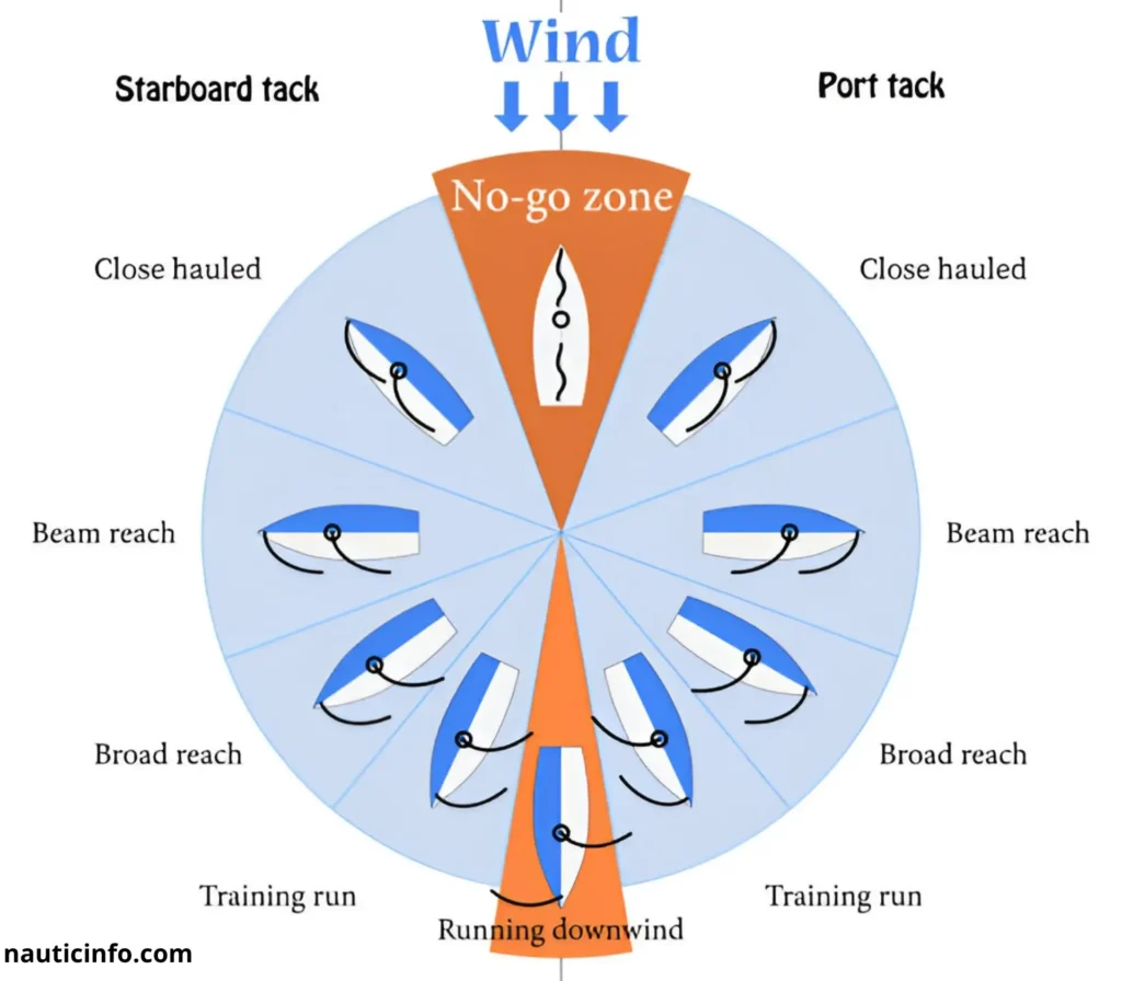 - A conical zone at the top (facing the wind): Colored in red and labeled “In Irons” or “No-Sail Zone” (approximately 45° on either side of the wind’s axis). In this zone, a sailboat cannot generate power and its sails will flap uselessly (luff).